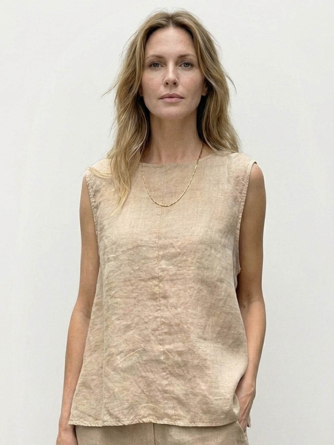 The sleeveless top skims through the body with enough room to move without feeling oversized. The straight-leg pants sit comfortably at the waist with no zips or buttons to deal with. Cotton crinkle texture means you can skip the iron and still look put-together.