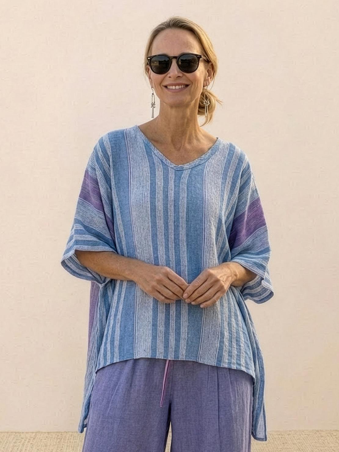 Machine wash on gentle cycle in cool water, or hand wash for extra care. Hang to dry to maintain the fabric's natural texture and prevent shrinkage.